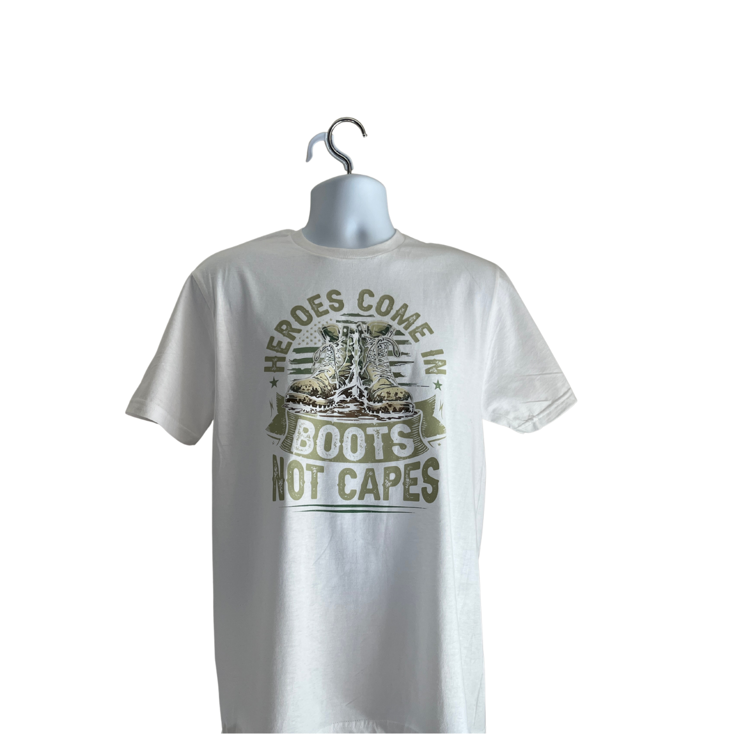 Our “Heroes Come in Boots, Not Capes” tee pays tribute to soldiers, veterans, and everyday heroes who wear boots instead of capes.