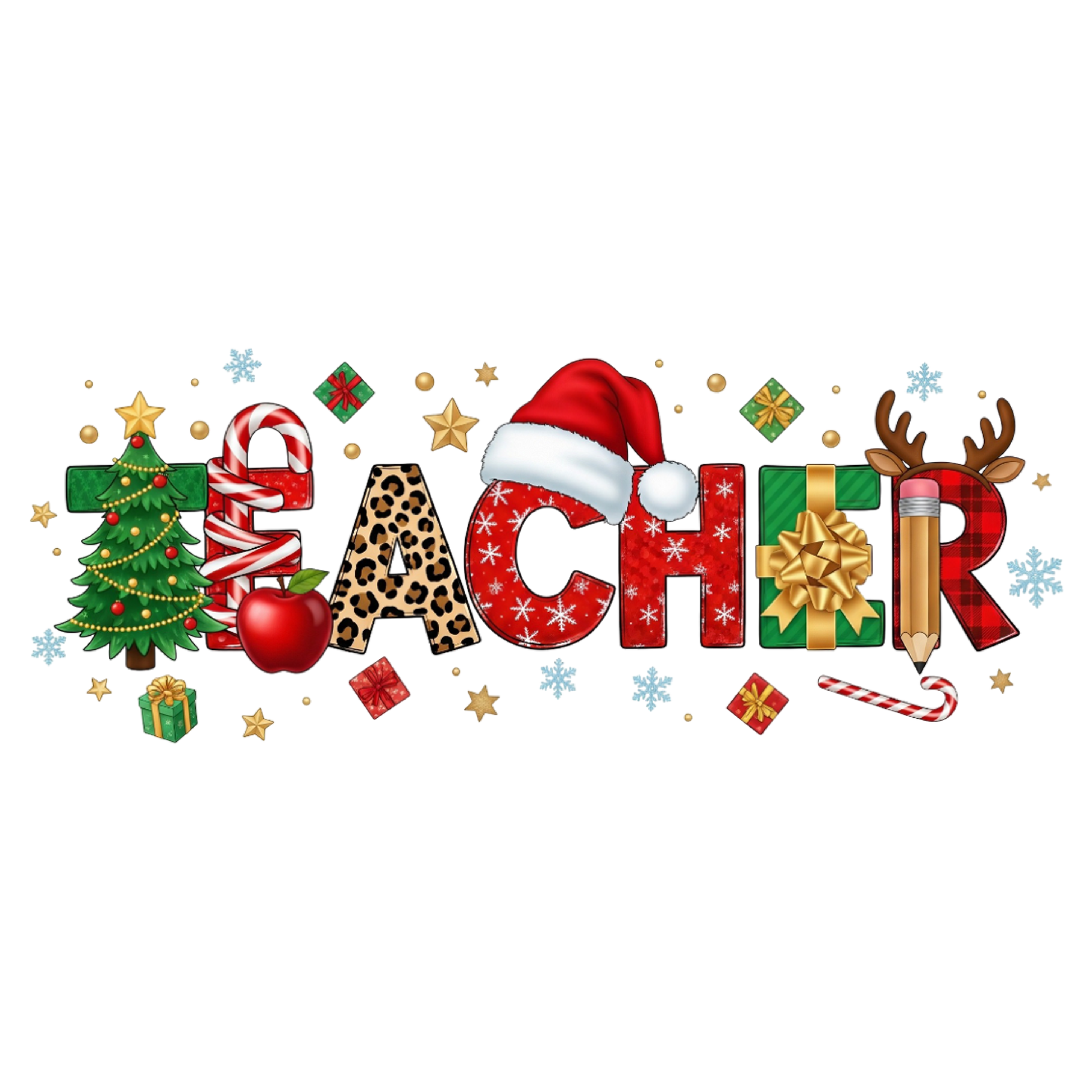 Designed especially for teachers who love spreading holiday cheer, this fun and colorful design features a Christmas tree, Santa hat, reindeer antlers, candy canes, gifts, and a classic apple — all wrapped up in festive style!